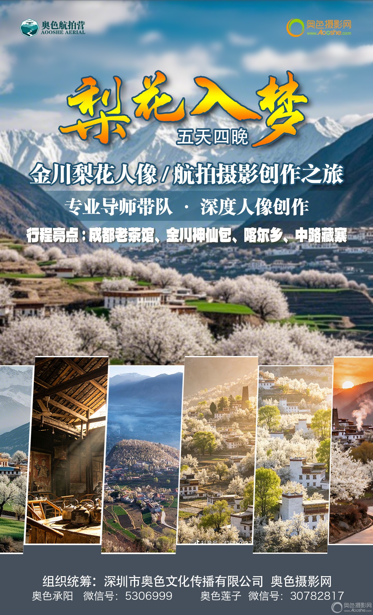 老师简介 老师作品 详细行程 (10人成行)奥色可根据天气或其它实际情况适当调整行程安排。 第一天:成都 · 茶馆光影 上午:抵达成都双流机场,车程约30分钟前往彭镇。 下午:深度拍摄观音阁老茶馆。最佳拍摄时段为12:00-16:00,可捕捉阳光透过窗棂形成的丁达尔光效。 住宿:返回成都市区入住,推荐太古里周边酒店,方便次日出发。 第二天:奔赴金川 · 初遇花海 上午:从成都出发,车程约4小时前往金川。 下午:抵达后先在喀尔乡梨花大道拍摄河谷远景,随后前往神仙包观景台拍摄梨花全景与雪山背景。 住宿:入住金川县梨花观景民宿,方便次日清晨拍摄。 第三天:上午,金川梨花人像拍摄。 下午:午餐后出发,前往中路藏寨,车程约2-3小时。 住宿:入住中路藏寨特色民宿,体验藏式风情。 第四天:藏寨全天 · 光影盛宴 清晨:前往观景台拍摄日出,捕捉晨光中的藏寨与梨花。 全天:深度拍摄藏寨梨花人像。可探访古碉楼,结合梨花、藏房、经幡等元素进行创作。 傍晚:拍摄藏寨日落,金色的阳光洒在梨花和碉楼上,氛围感十足。 第五天:返程成都 早餐后从中路藏寨出发,返回成都,结束愉快的梨花旅拍之旅。可根据航班时间安排成都市区的自由活动。 服装道具 服装:待定 道具:工作室现有道具。摄影师有适合的道具欢迎带上。